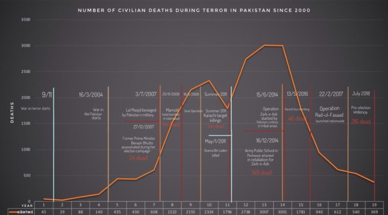 Data visualization : Number of civilian deaths in Pakistan due to terrorism each year since 2001. Includes important events [OC]