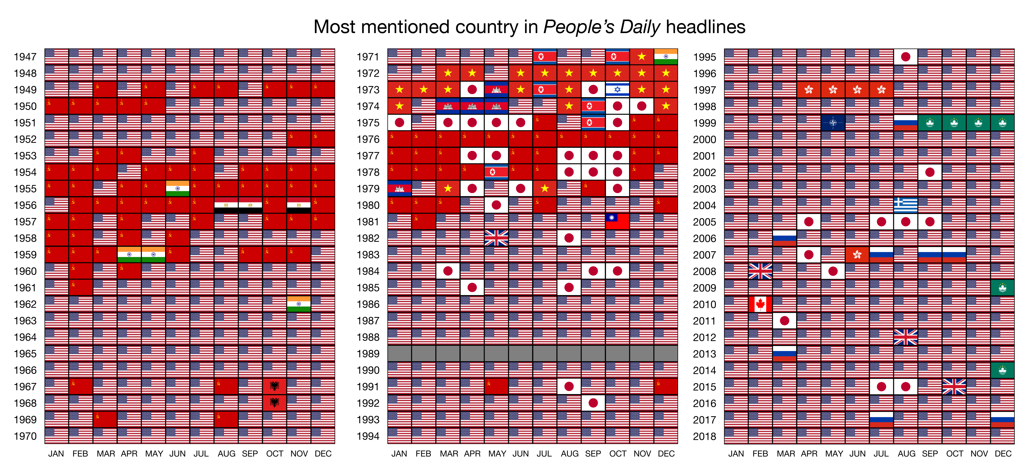Data visualization : Which countries have been at the center of China’s attention? I analyzed the most mentioned foreign countries in headlines from the prominent Chinese newspaper People’s Daily. [OC]
