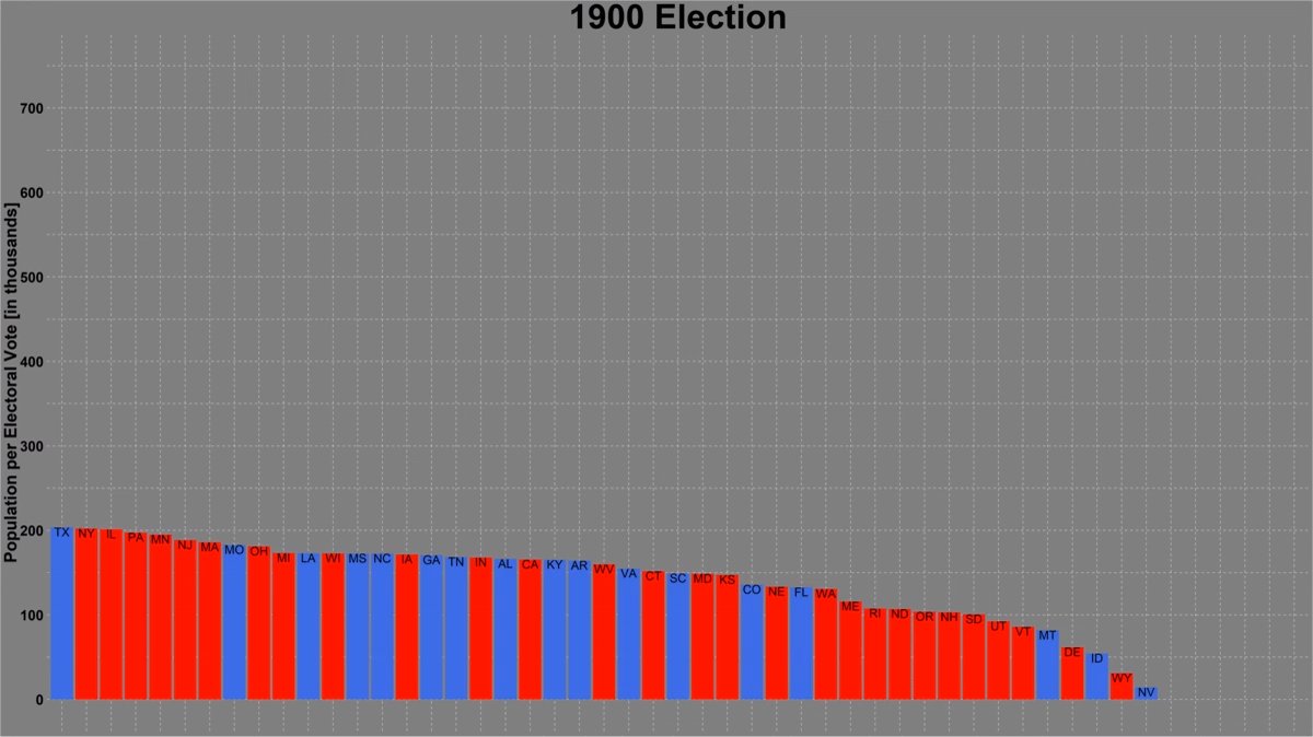 Population per Electoral Vote and Party by State 1900-2016 elections [OC]