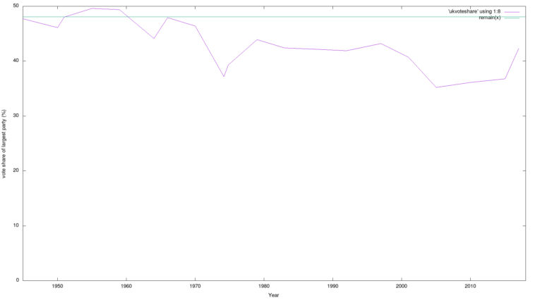 Vote share of largest party (by seats won) in UK elections since 1945, remain(x) is the share of people who voted to remain in the EU in 2016 [OC]