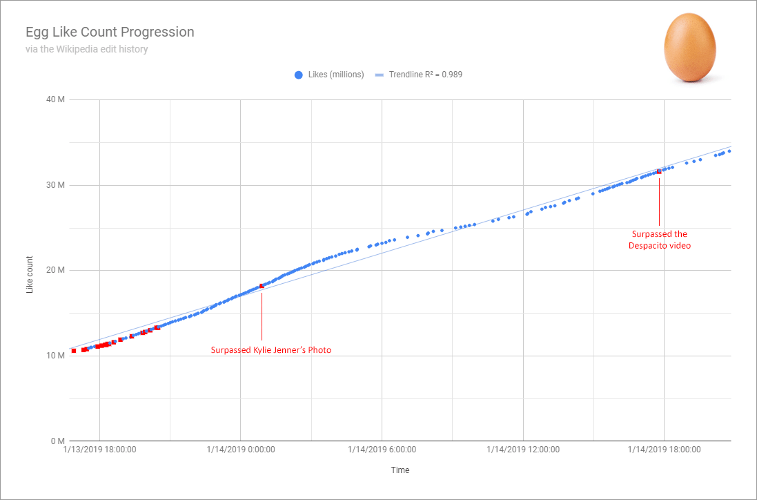 Data visualization : [OC] The World Record Egg like count progression, since it became the 20th most liked Instagram post