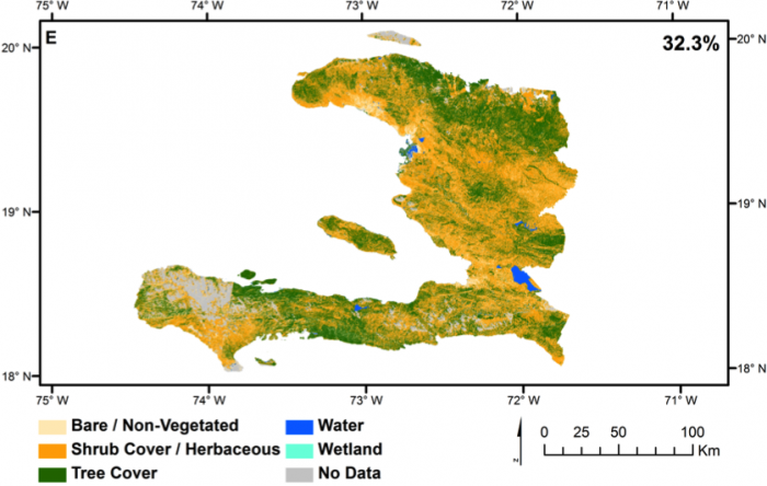Map of land usage in Haiti created using high resolution satellite imagery, showing tree cover at 32.3%