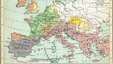 in Map Map : Second of four: Change in Europe, 5th & 6th centuries A.D. Europe c. 526. Muir, Ramsay, and George Philip. Philips’ Historical Atlas: Mediæval and Modern. 6th ed., George Philip & Son, Ltd., 1927.