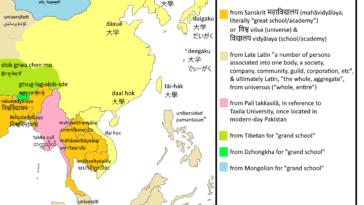 in Map Map : Origins of the words for “university” in various Asian languages, color-coded by root language. Apologies in advance for errors, inconsistencies, and that hastily drawn internal linguistic border in China [OC] [1097×952]