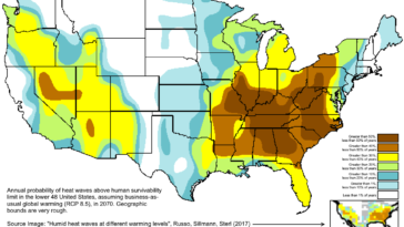in Map Map : Annual probability of heat waves above human survivability limit in the United States in 2070 [OC]