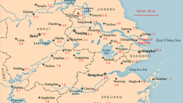 Map : Yangtze River delta cities (largest: Shanghai) with their prefectural (administrative) population in millions. Scale for distance added. Whole area has 40% more people than Germany. Quick modification of map from Wikipedia (User:Seasonsinthesun) I made while bored. Sorry for any errors. [1266×901]
