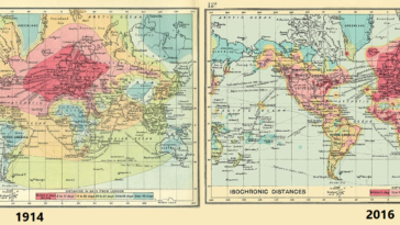 in Map Map : How long it took to travel from London to the rest of the world: https://www.dailymail.co.uk/sciencetech/article-3385856/What-difference-century-makes-Maps-reveal-long-takes-travel-world-1914-2016.html