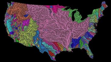 in Map Map : Map shows every river basin of the US with a different color and width depending on water depth