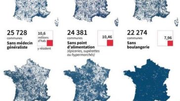 in Map Map : Numbers of cities/villages in France without : 1. Doctors – 2. Supermarkets – 3. Bakery – 4. Post Office – 5. Elementary School – 6. Phone Network and total number of inhabitants living in those.