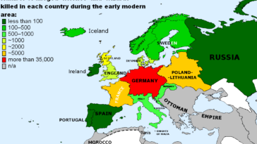 in Map Map : Number of alleged ‘witches’ and ‘wizards’ killed in witch trials during the early modern area.
