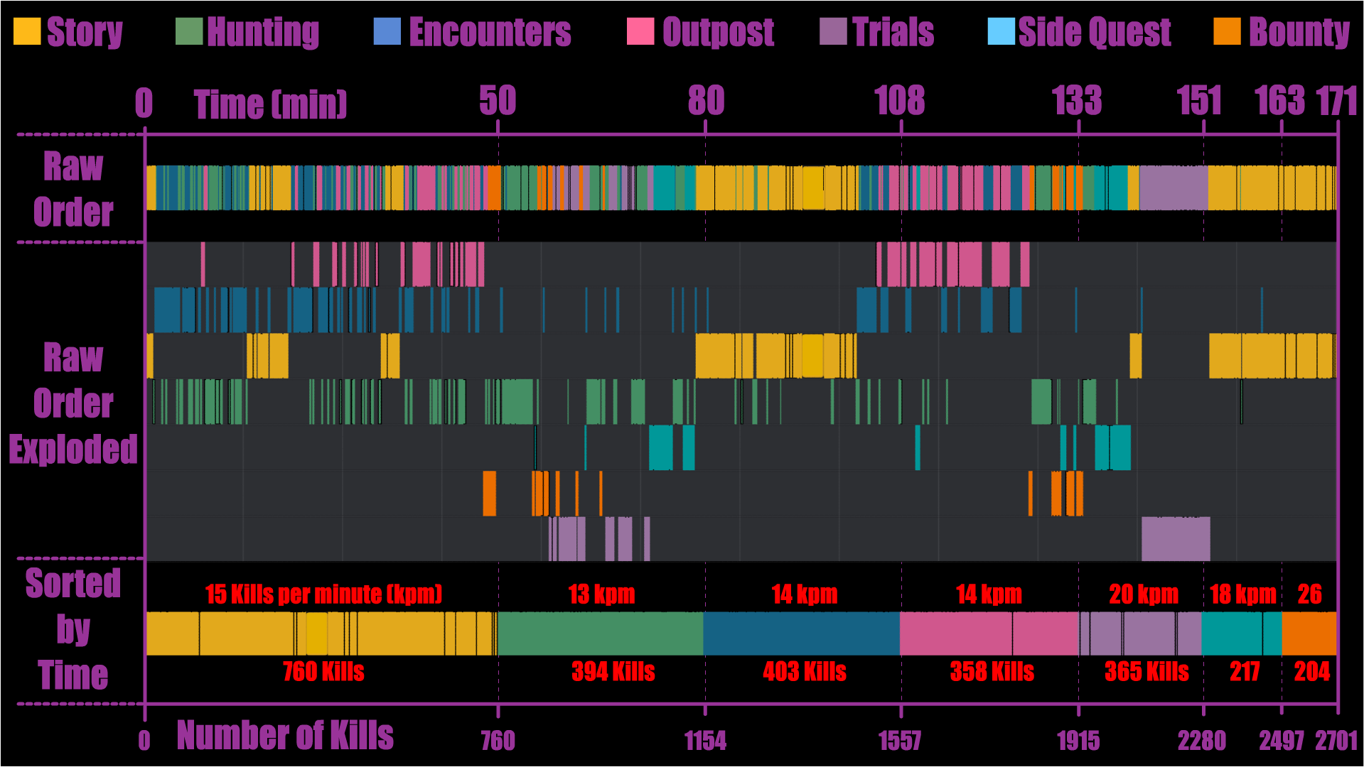 Chart : Captured, compiled & categorized every fight in a Far Cry 3 playthrough. Determined the number of kills/min for each scenario type. Each thin line represents one fight clip.