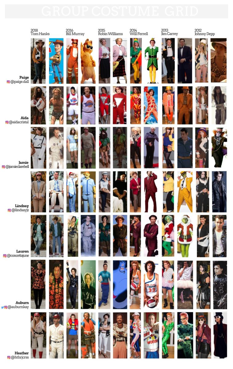 Infographic : I made a grid/infographic of all my friends next to their character for our annual group Halloween costume.