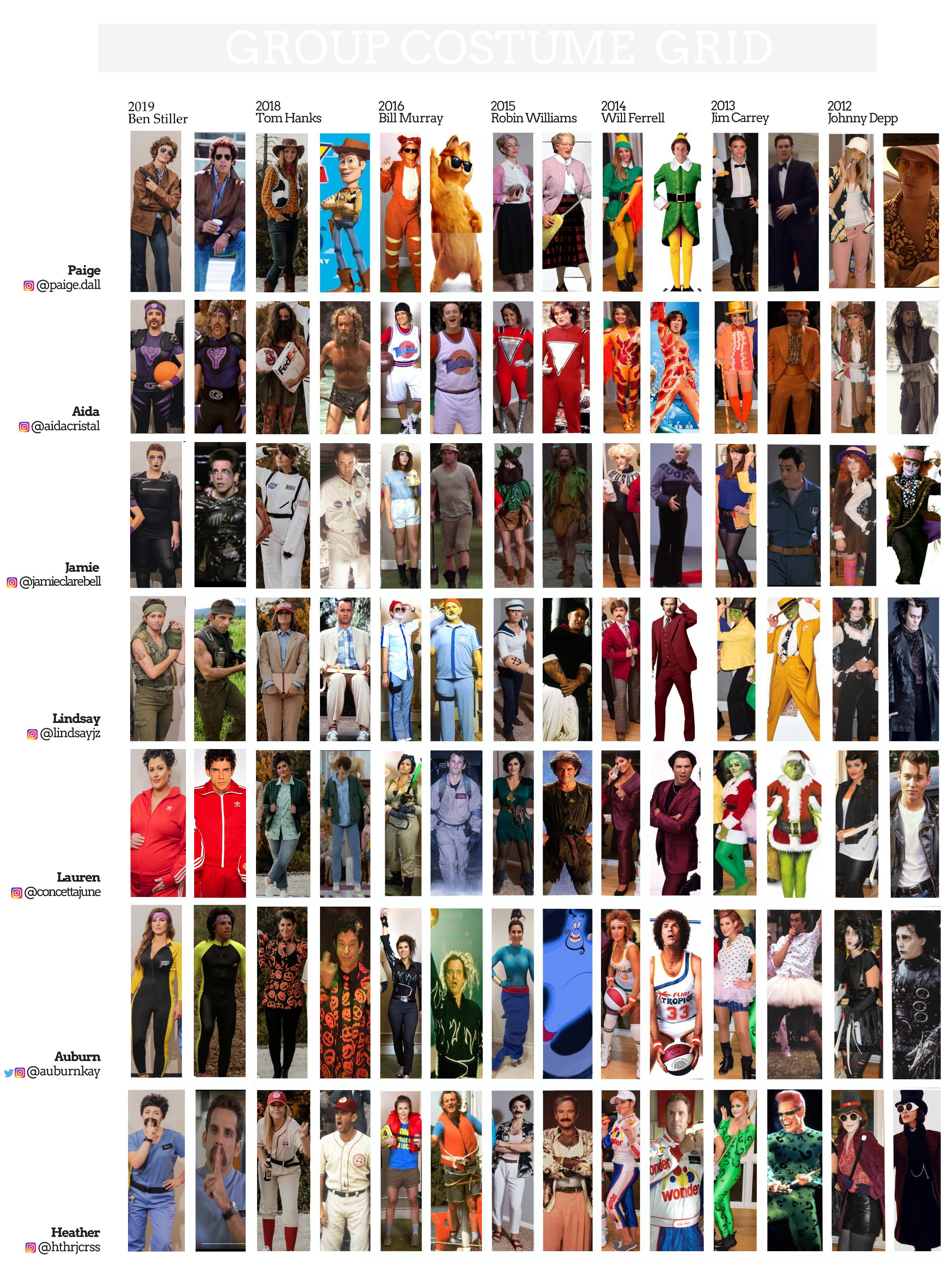 I made a grid/infographic that tracks 7-years of me and my friends costumes next to the character for our Halloween tradition.