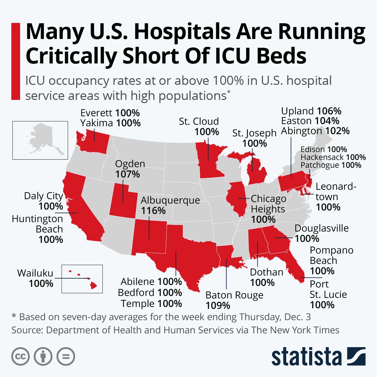 Infographic : ICU Occupancy in hospital service areas across the United States is at or above 100%