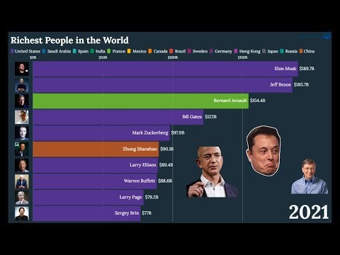 In this video you can see the richest people in the world between 2000 and 2021. Elon Musk went from 27 billions to 185 billions in 2020.