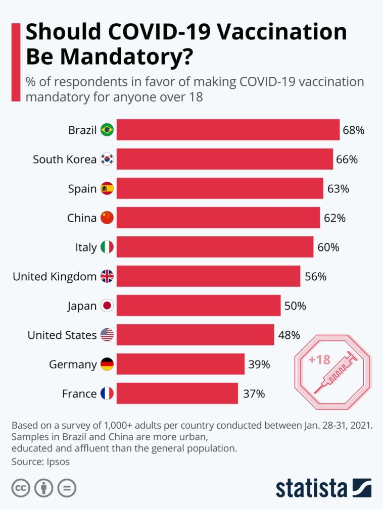 Infographic : Roughly half of Americans believe the COVID-19 vaccine should be mandatory for those without justified reasons to opt-out