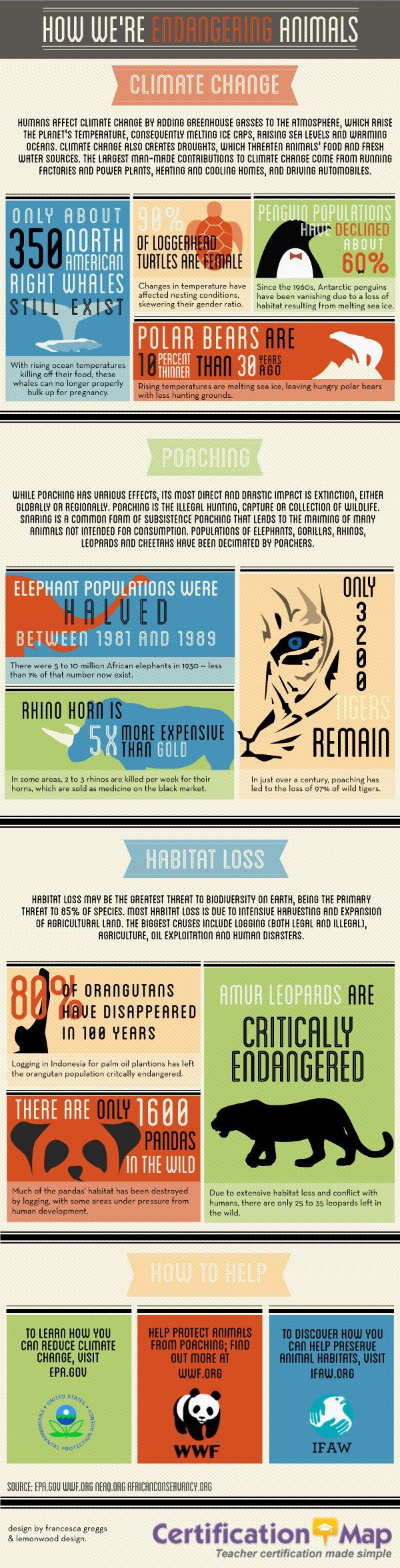 Our actions have a direct effect on changes in the ecosystem. Find out Howe We're Endangering Animals in this infographic from National Geographic