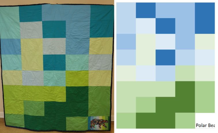 A data visualization, in quilt form. The coloured blocks represent the extent of arctic sea ice from 1979-2017, while the quilting shows the rising sea temperatures over the same time period. [OC]