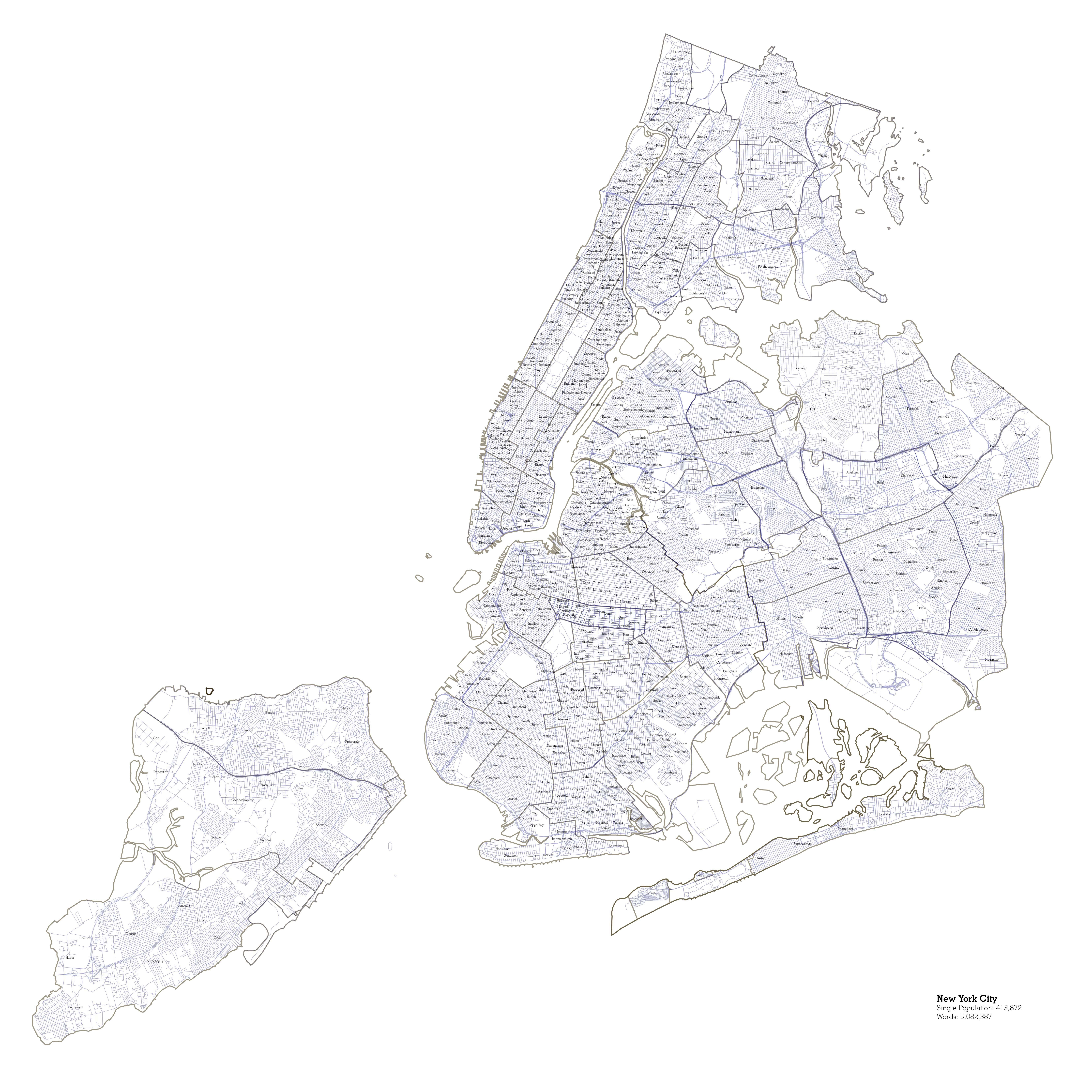 A map of the United States with city names replaced by unique words used by residents in their online dating profiles