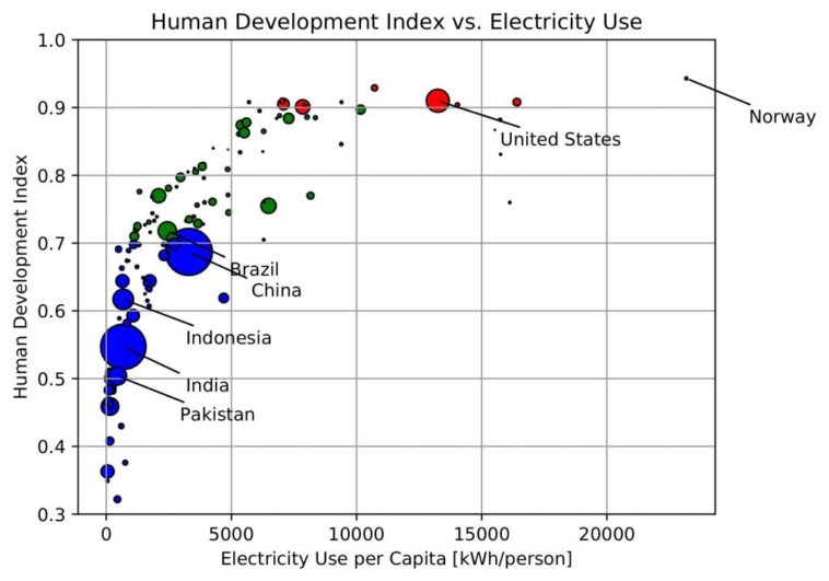 Data visualization : A measure of quality of life (HDI) vs. electricity use worldwide [OC]