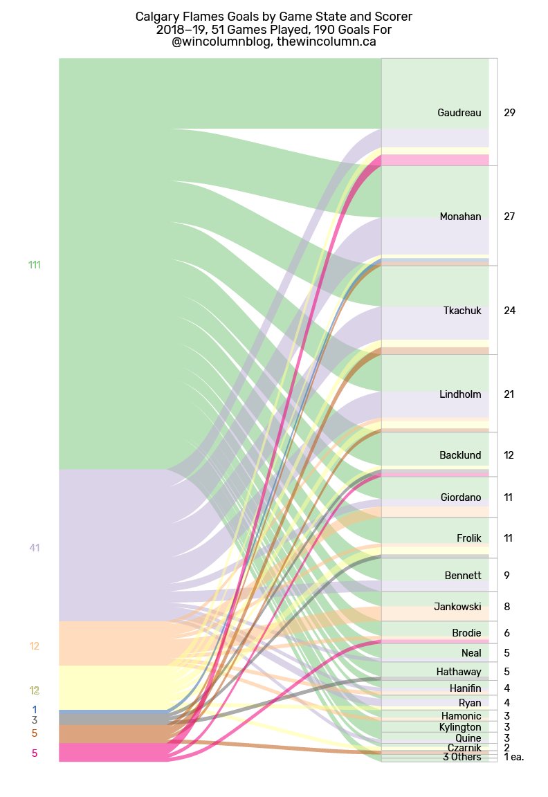 Data visualization : A mid-season visualisation of Calgary Flames goals by scorer and game-state [OC]