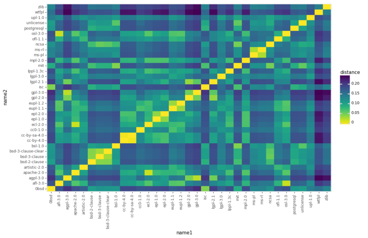 Data visualization : A similarity of Open Source Licenses calculated by Normalized Compression Distance [OC]