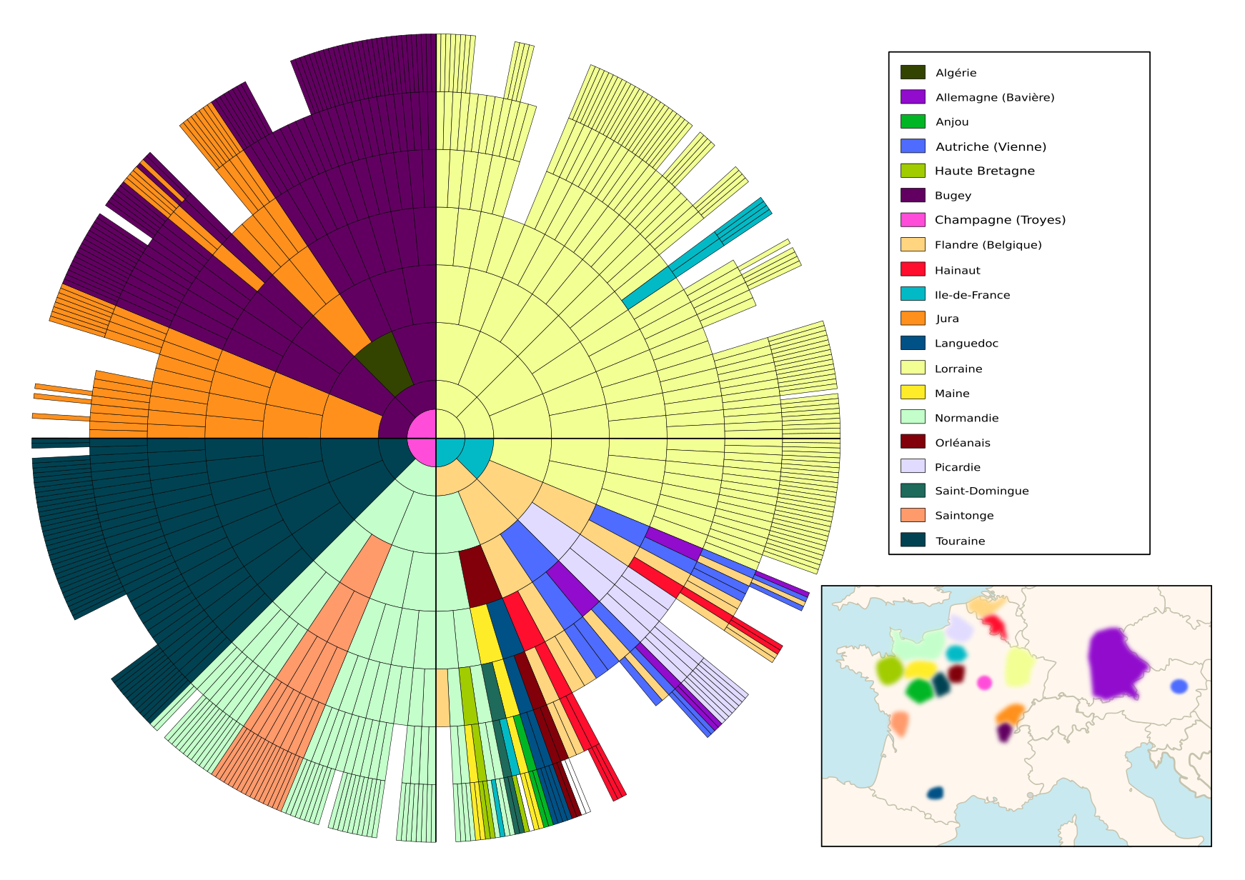 Data visualization : All my known ancestors colored by their place of birth [OC]