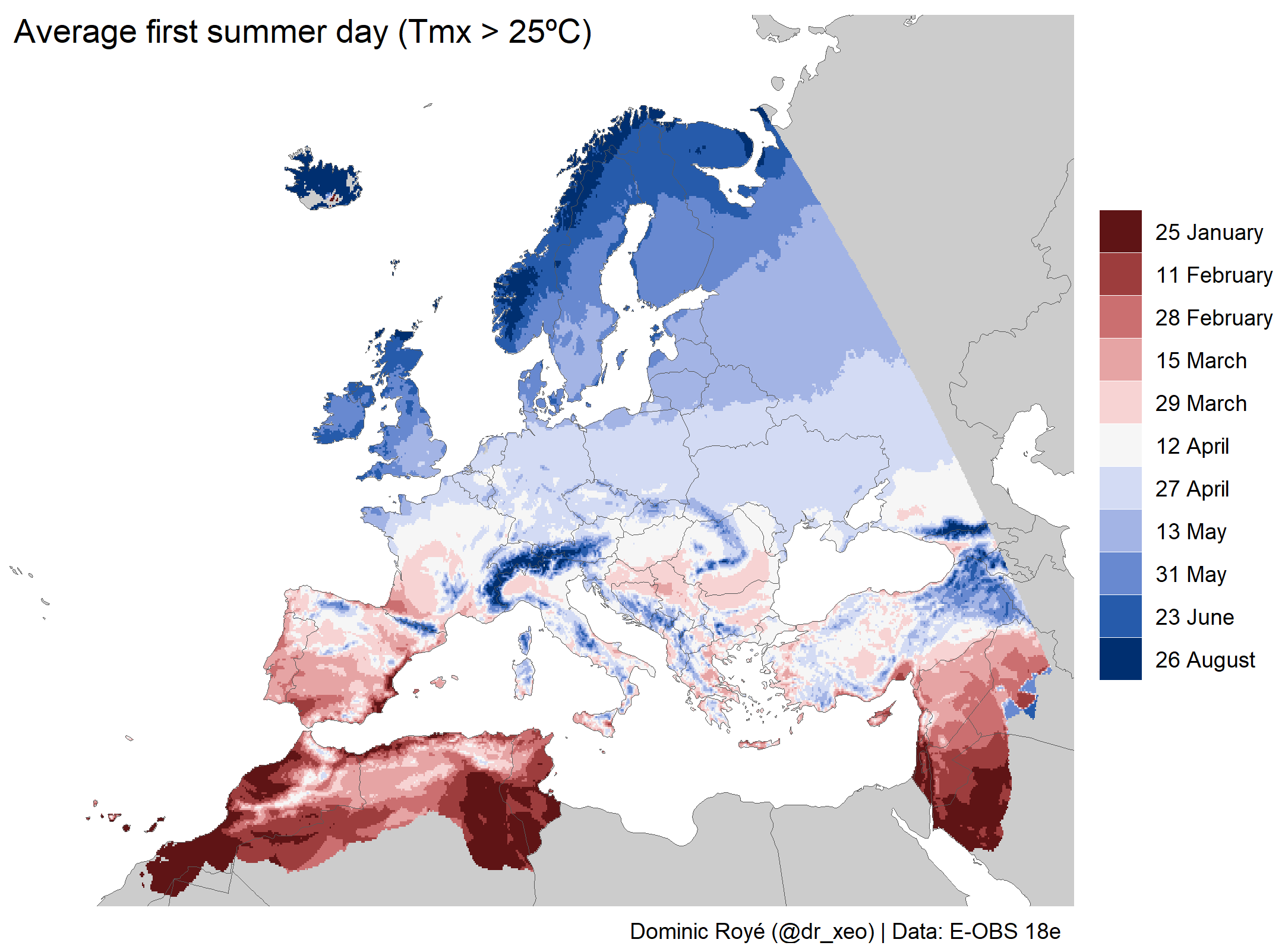 Data visualization : Average first summer day (maximum temperature > 25ºC) for Europe [OC]