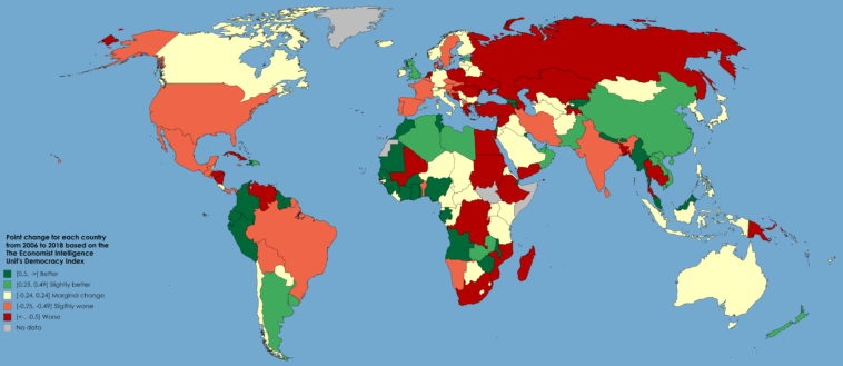 Change in each country’s democracy index score from 2006 to 2018 [OC] [7441×3225]