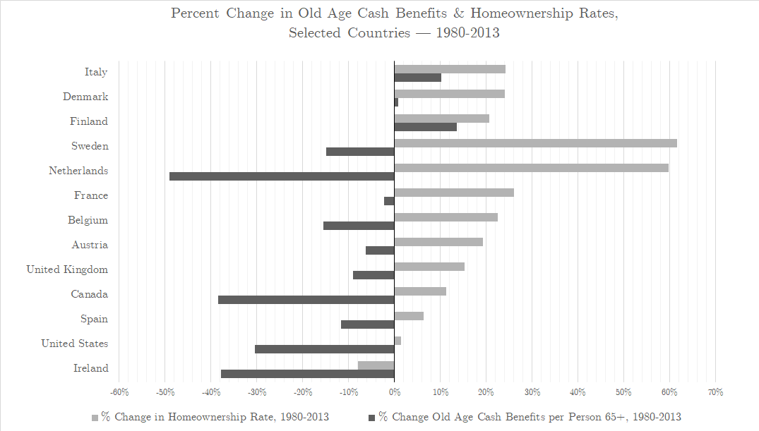 Change in Homeownership Rates and Direct, Cash-Benefit Pensions by Country, 1980-2013 [OC]