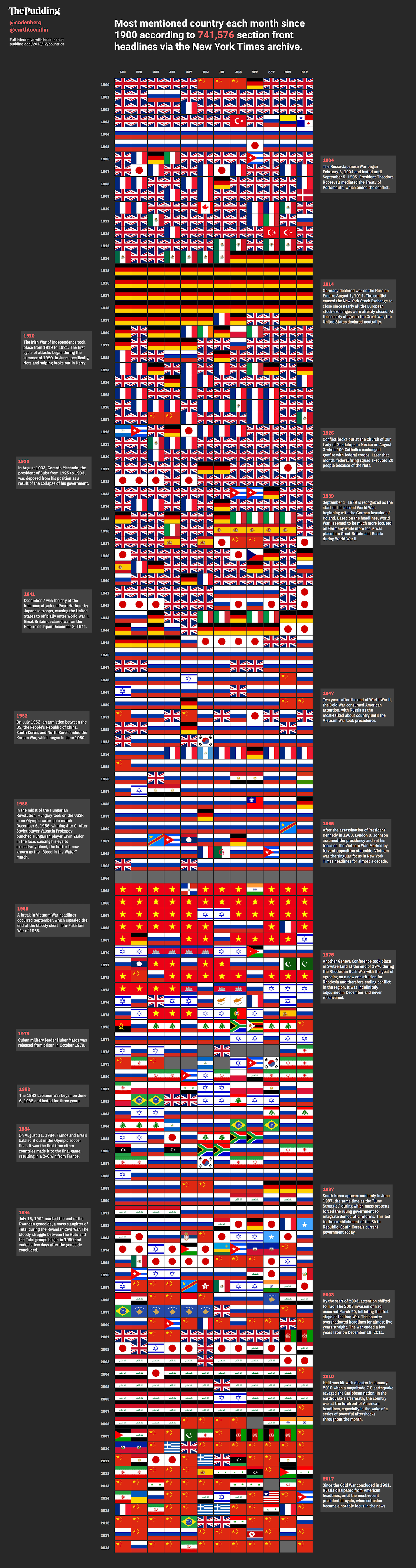 Countries that appeared most frequently in NYT headlines each month since 1900 [OC]