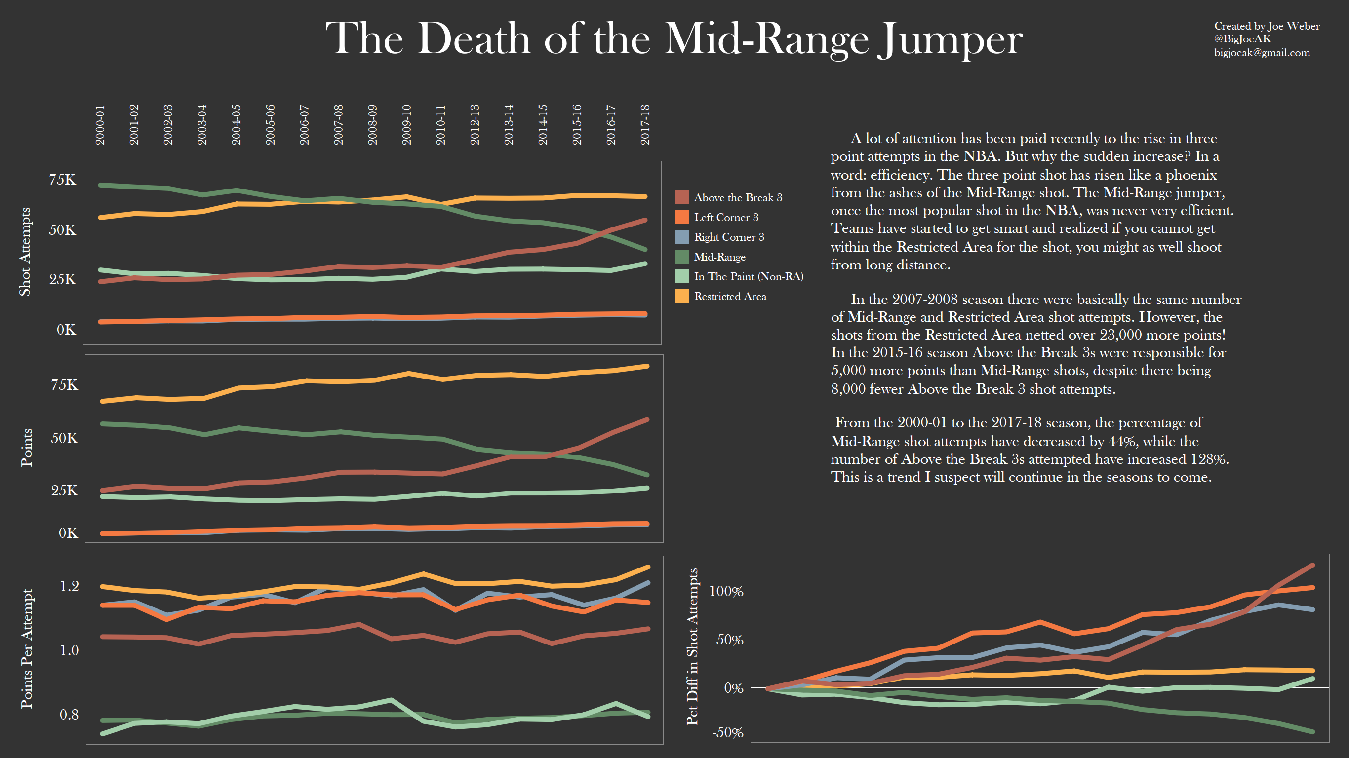 Data visualization : Death of the NBA Mid-Range Jumper [OC]