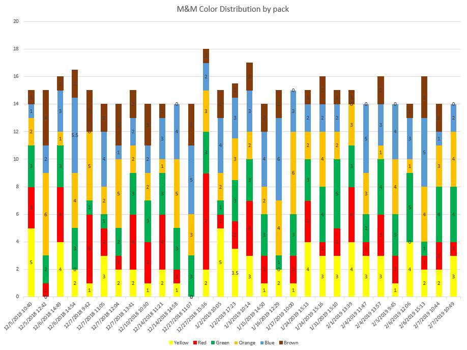 Data visualization : Distribution of M&M Color by Pack over a 2 month period [OC]