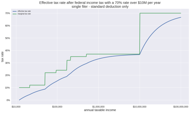 Effective federal tax rate vs income with a 70% rate added once you hit $10 million [OC]