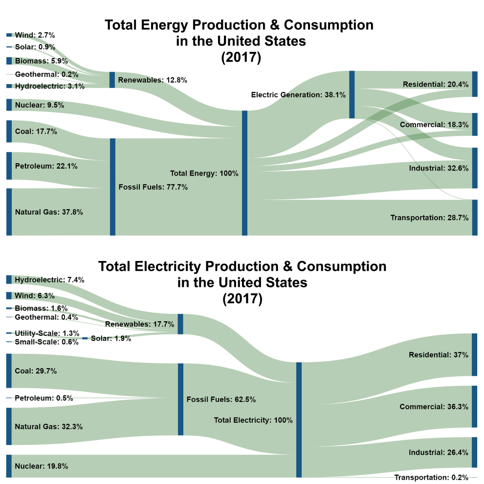 data visualization : Energy in the United States, production and usage of electricity compared with overall energy [OC]