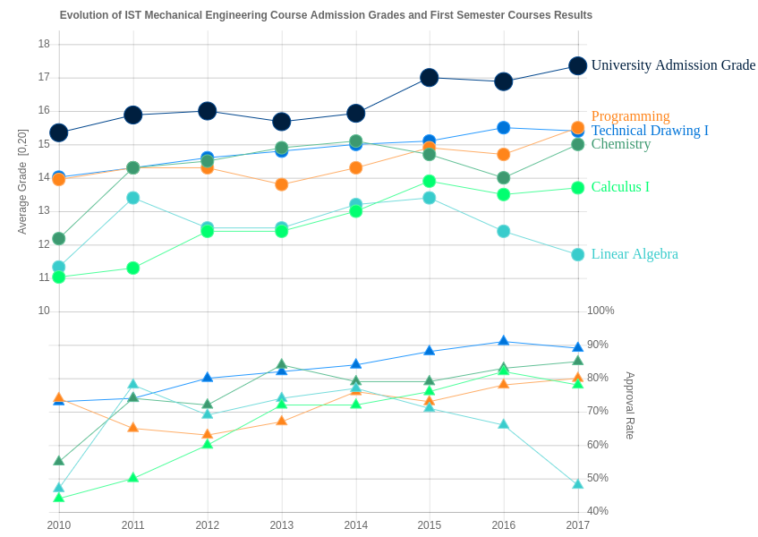 Data visualization : Evolution of IST Mechanical Engineering Course Admission Grades and First Semester Courses Results [OC]