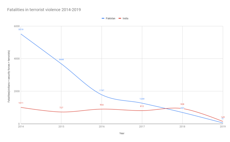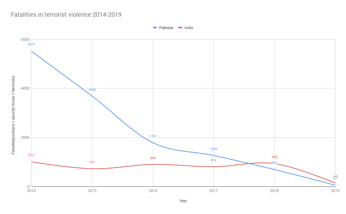 Fatalities in terrorism-related violence in Pakistan and India(2014-2019) [OC]