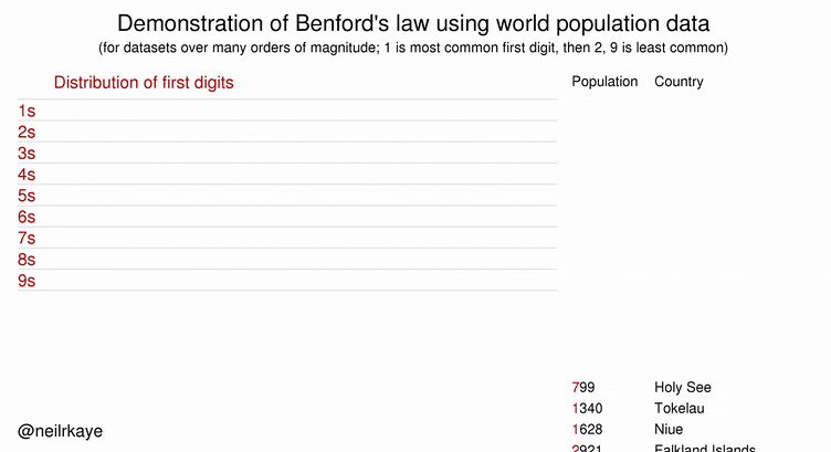 Data visualization : For real world data “1” is by far the most common first digit [OC]