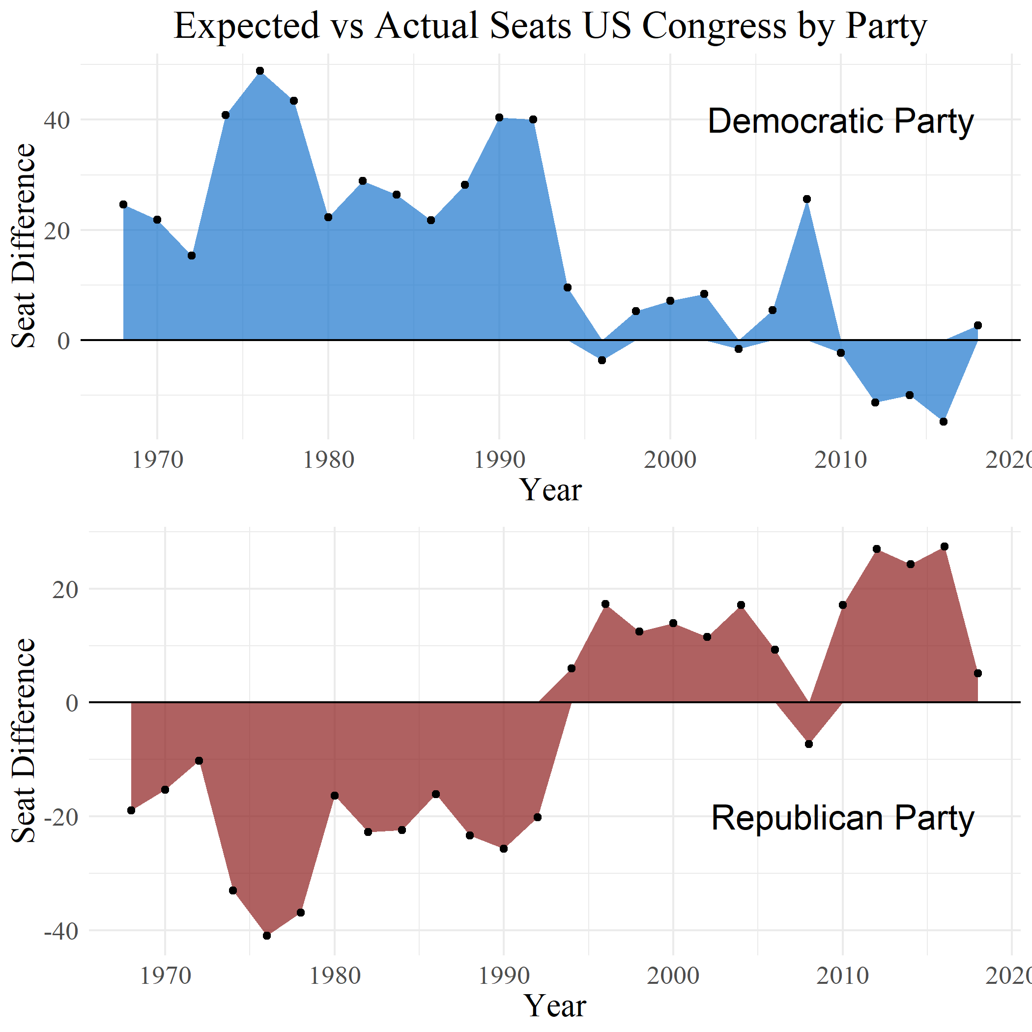 Graph of expected seats vs actual for US political parties in congress. Expected calculated from percent of total vote nationally multiplied by 435. Data courtesy of wikipedia. [OC]