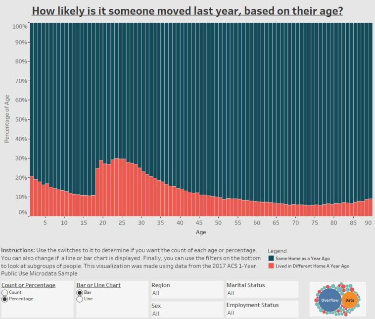 data visualization : How likely is it someone moved last year, based on their age? [OC]