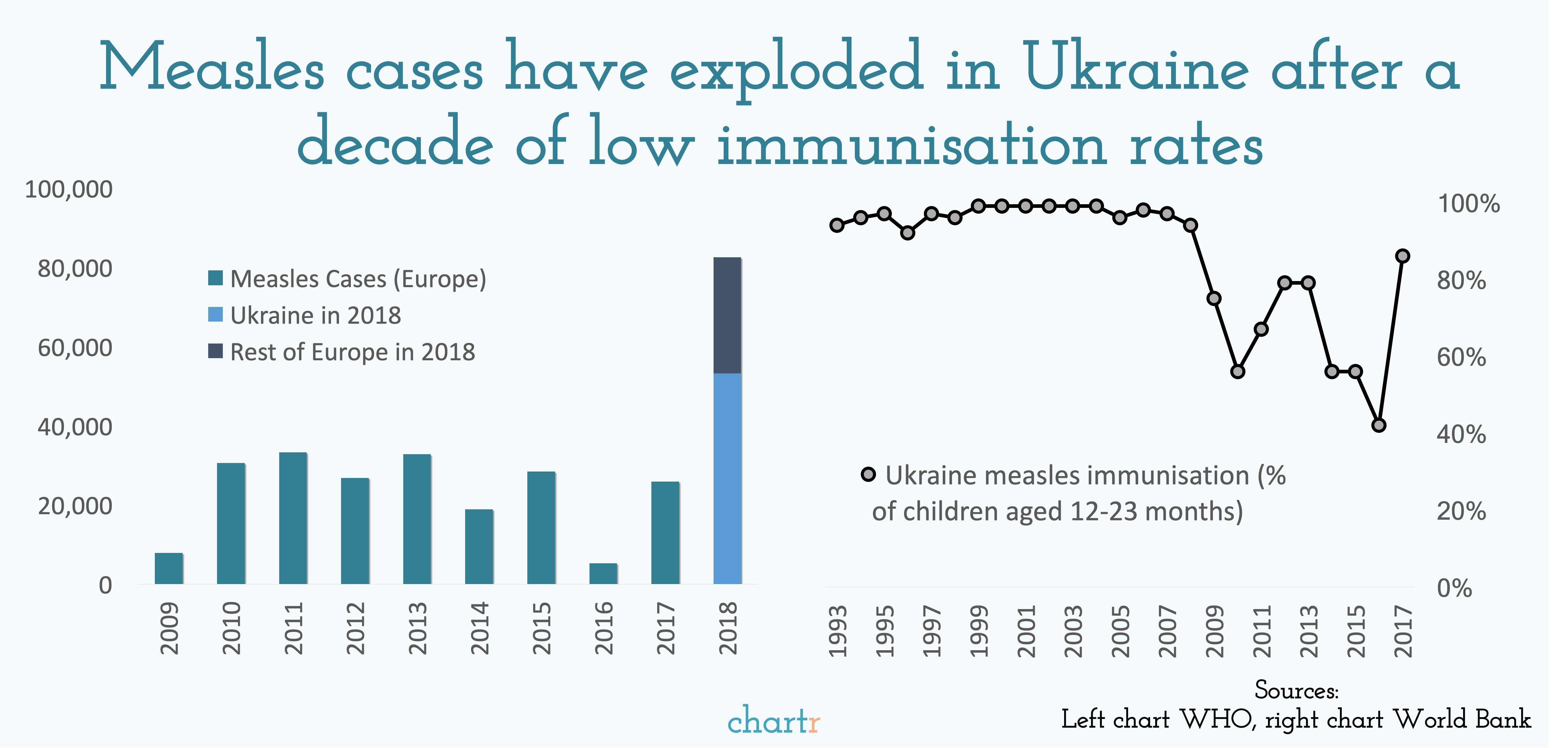 Data visualization : How measles has tragically exploded in Ukraine after immunisation rates fell over the last decade. [OC] from instagram @chartrdaily.