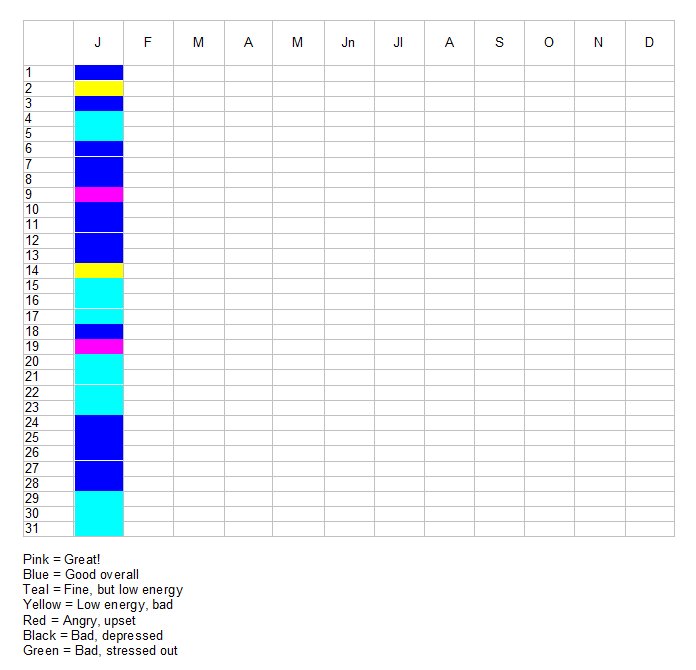 I am (amateurishly) tracking my day-to-day moods for 2019. Here’s how I felt each day of January. [OC]