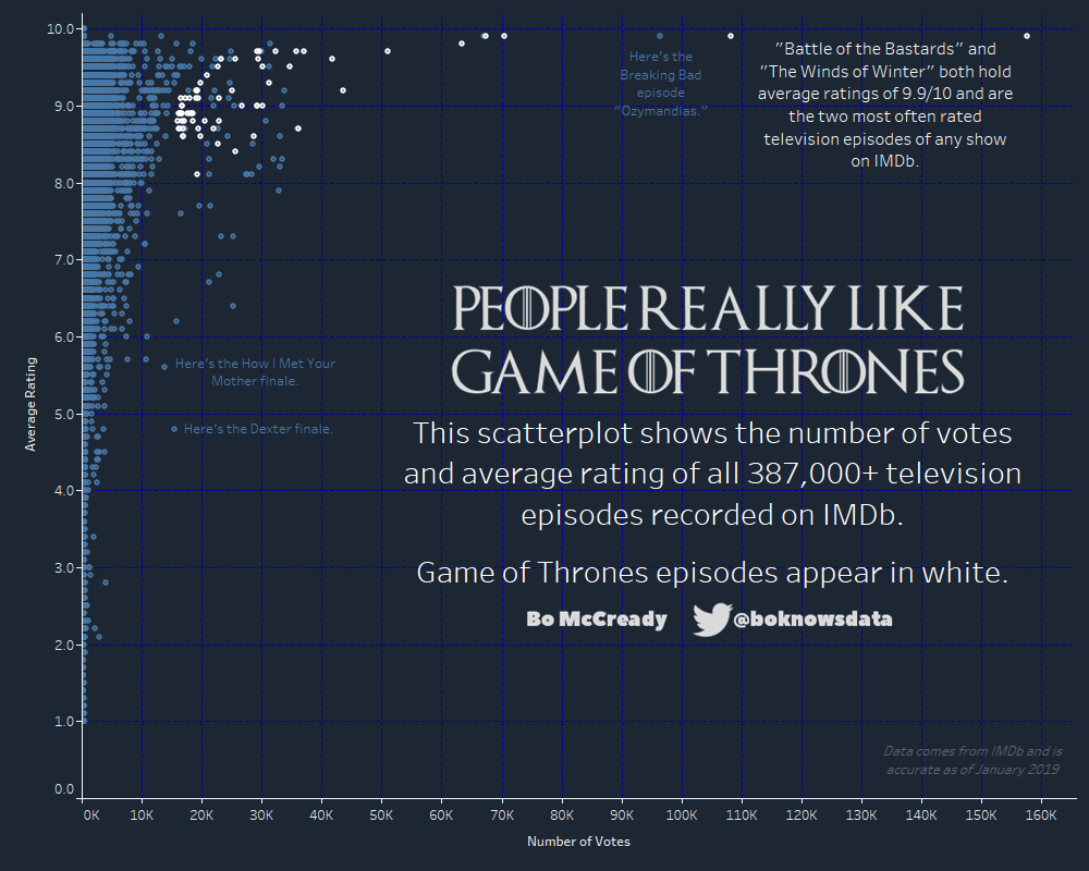 Data visualization : I made an interactive scatterplot of all 387,000+ television episodes with ratings on IMDb. Turns out people really like Game of Thrones. [OC]