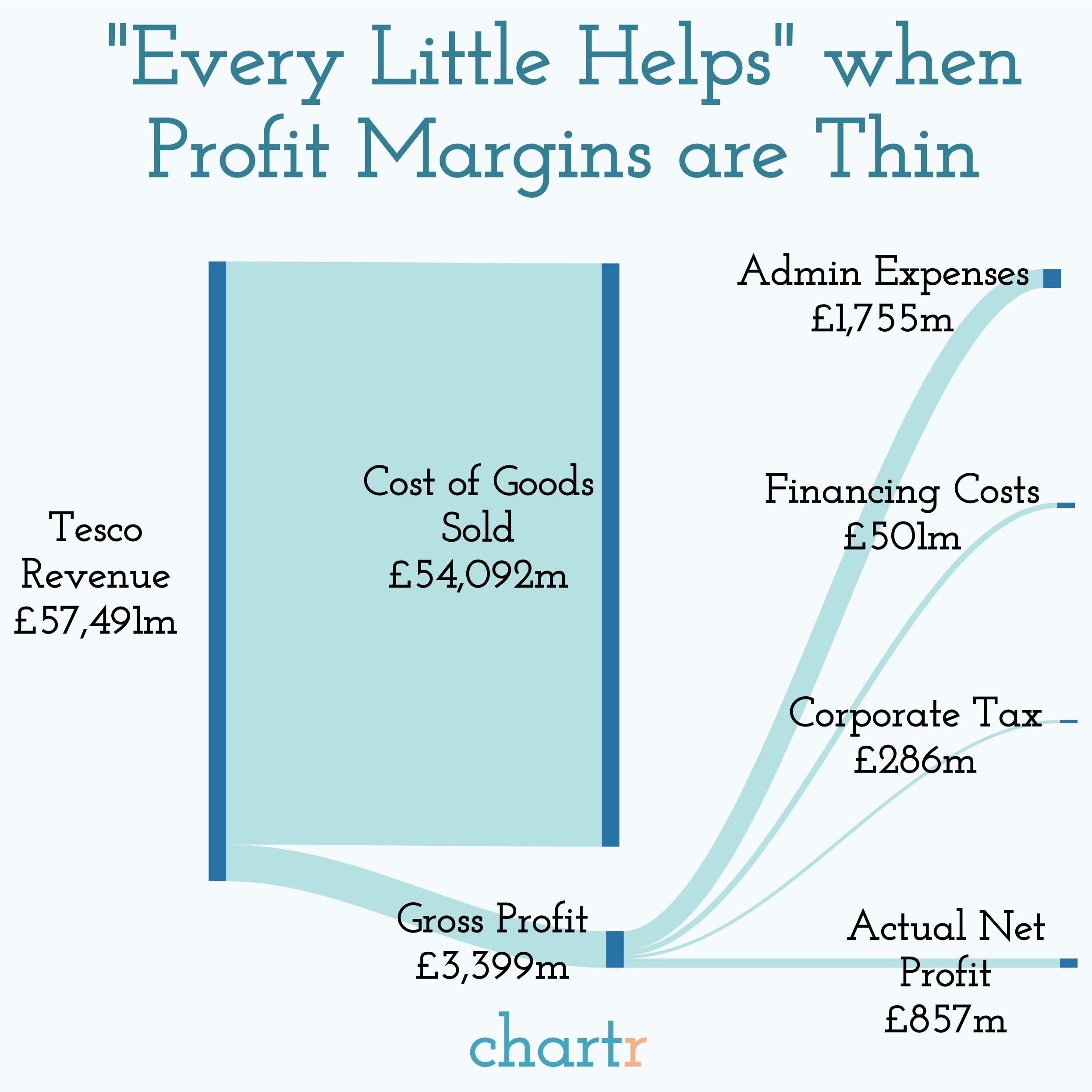 Data visualization : Illustration of how razor thin supermarket profit margins are in the UK using Tesco Annual Financial Report. [OC] from Instagram @chartrdaily.