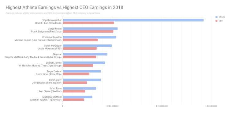 Data visualization : In 2018, the 10 highest paid athletes earned more than the 10 highest paid CEOs at every rank [OC]