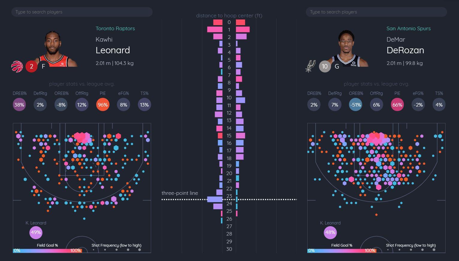 Data visualization : Kawhi Leonard vs. DeMar DeRozan – shot charts and stats comparison [OC]