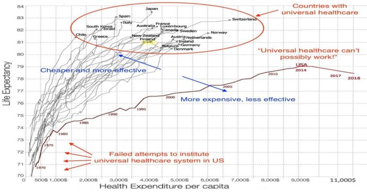 Data visualization : Life expectancy for countries with universal healthcare and the United States