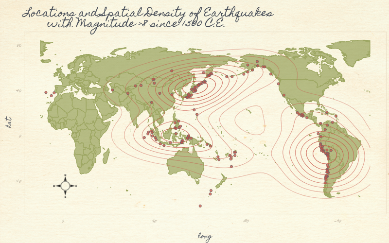 Location and Spatial Density of Earthquakes with Magnitude >8 since 1500 C.E. [OC]