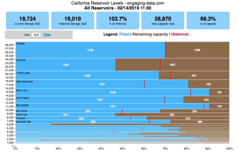 Data visualization : Lots of winter rain in California has reservoirs over their historical average and climbing hourly [OC]