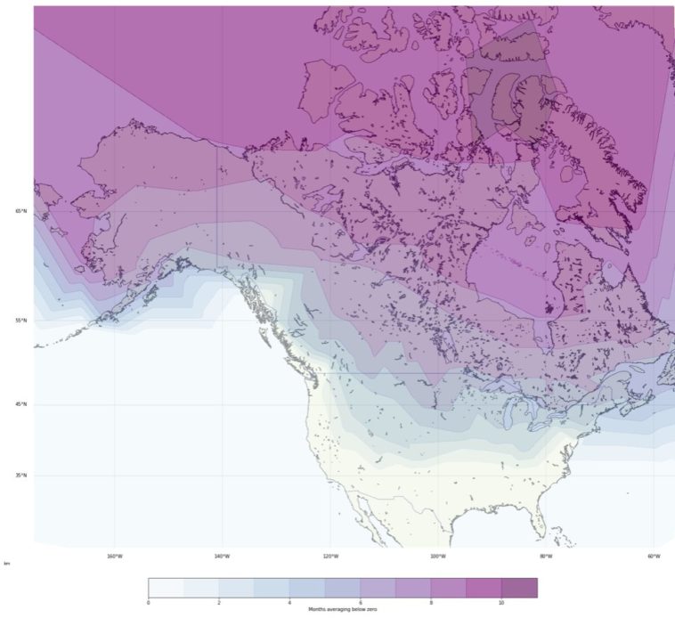 Data visualization : Map that shows how long it avarages below zero in northern america [OC]